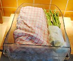 Meine ganz persönliche Empfehlung: kaufen Sie sich keinen runden Spargeltopf in dem die Stangen aufrecht stehen. Wer nicht möchte, dass sein Spargel im Kochwasser gart, der sollte auf die neu auf dem Markt erhältliche Spargelfolie zugreifen – oder Bratfolie nehmen. Was früher für Braten üblich war, kommt jetzt wieder mit dem Spargel in Mode. Legen Sie Ihren Spargel in den Bratschlauch, geben Gewürze und etwas Wasser hinzu und garen Sie ihn im Backofen. Das Aroma bleibt dabei herrlich erhalten.